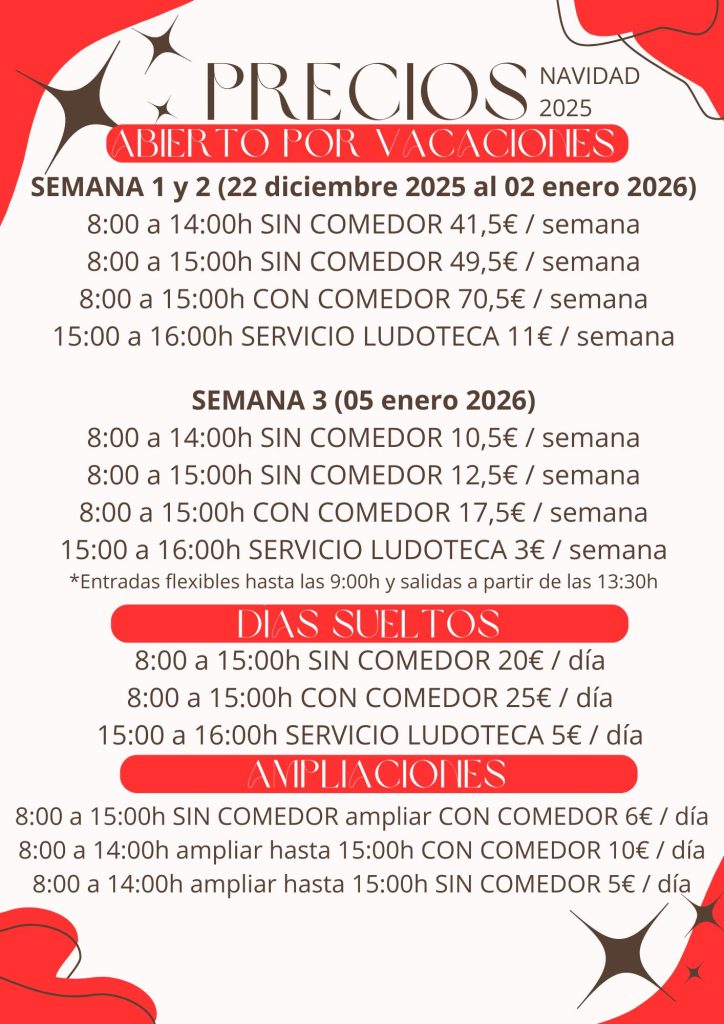 MUY IMPORTANTE: Fecha límite de inscripción para alumnado ACNEAE/ACNEE hasta el lunes 24 de noviembre 2025 y resto alumnado hasta el miércoles 10 de diciembre 2025 (una vez finalizado el plazo, si quedaran plazas vacantes se aceptarán nuevas altas o ampliación de semanas). Será la empresa la que se pondrá en contacto con las familias.